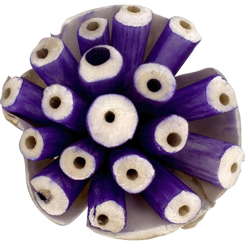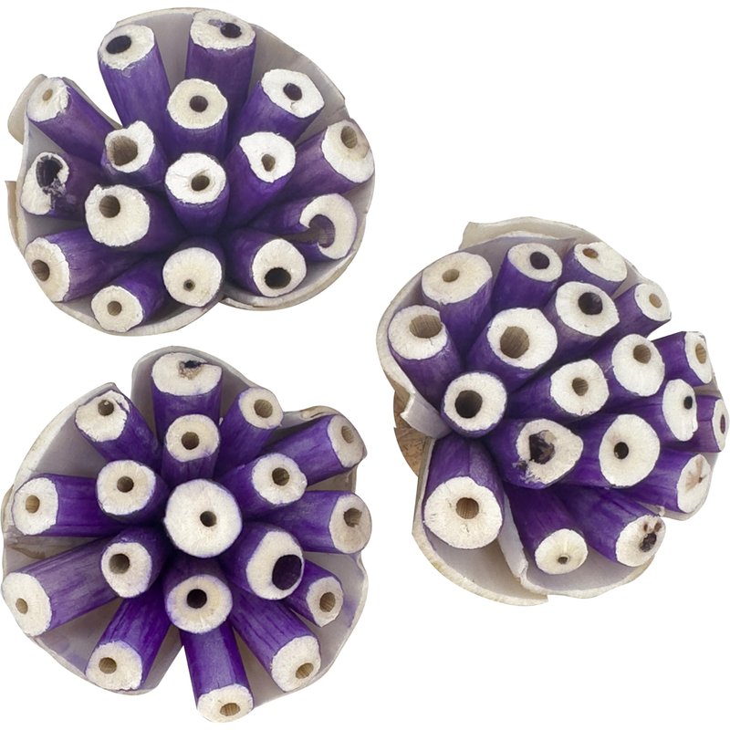 The 5304 Pk3 Small Sola Blooms Blue from M&M Bird Toys are handmade, delightfully fun to shred, sola wood bird toys. Each pack includes (3) ready to play with blue colored sola blooms. These are made from all natural air dried sola wood thats been colored with food dye. The insides of the blooms are formed from small pieces of sola wood sticks that have been tied together on the bottom with a length of natural twine. The outside of each blood has a thinly sliced piece of sola bar that surrounds it. These unique foot toys offer pets lots of places to grab with beaks and feet. The tops of the blooms have plenty of places to stick in treats to increase the fun. The foot toys are lightweight and easy for species of all sizes to enjoy. [Specification] Diameter: (2.75) inches or (7) cm Height: (1.75) inches or (4.5) cm Weight: Under (3) ounces A bird safe chewable foot toy Individually checked for quality by Mai in our small Florida shop
