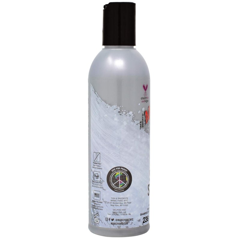 Introducing Tish & Snooky's MANIC PANIC's cruelty-free, vegan and paraben-free hair care products made to complement their world-famous iconic hair colors. Silver Stiletto Violet Toning Shampoo helps maintain platinum locks by imparting a soft violet hue to reduce the appearance of brassy, yellow tones. Silver Stiletto Shampoo can also be used to tone hair before applying your favorite MANIC PANIC semi-permanent colors or to help maintain grey, purple, and blue hair. How to use: Always do a test strip to determine how long to leave on hair. Apply to hair and massage in evenly. Let sit for a few minutes -the longer you leave it in, the more purple it deposits, so start conservatively until you find just the right timing for your hair. Rinse well. Use in place of your regular shampoo every other wash or as often as needed. Follow with MANIC PANIC Silver Stiletto Conditioner or your favorite MANIC PANIC semi-permanent hair color.