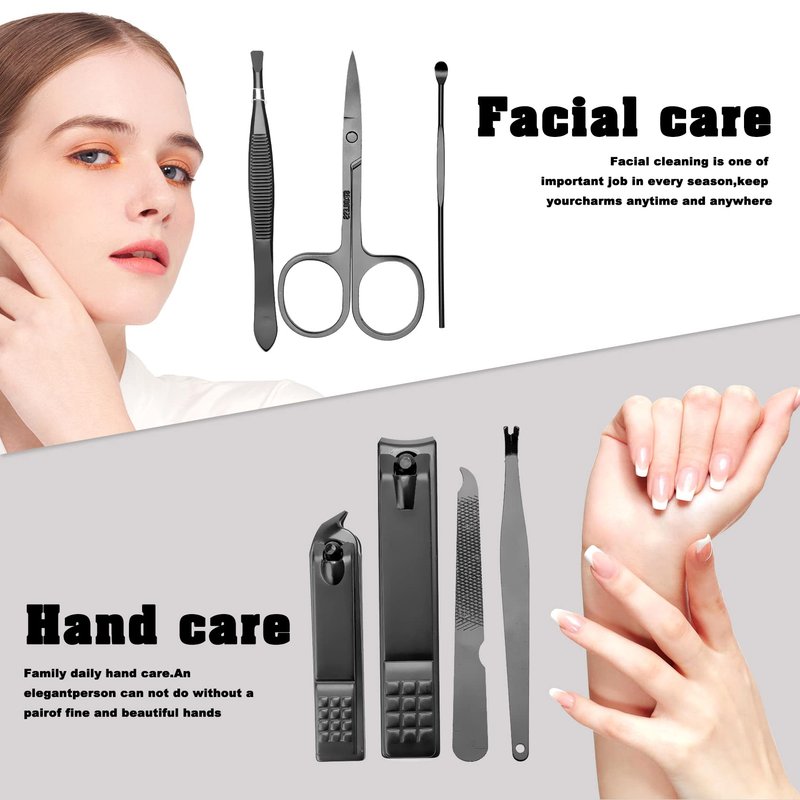 - Manicure Set:Manicure Kit Contains nail and toenail tools,Multifunctional includes hand care, facial care,and foot care tools.Manicure Kit contains 7 tools for hand care, facial care, and foot care which can meet all of your needs.No need to pay for a single nail clipper or Nose Hair Scissors, money can be saved. Even thick nails can be easily cut off directly, No need to use a lot of force.