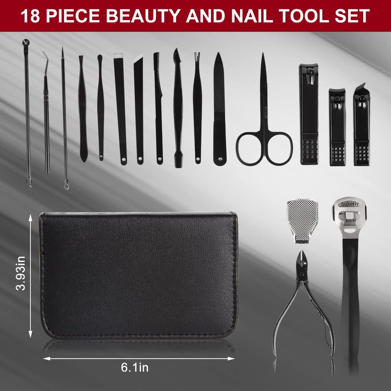 Best Christmas Gift All nail tools in the nail clipper kit are made of high-quality stainless steel, never rust. Nail clippers, cuticle removers, and nail clippers are sharp and comfortable to hold. The tools inside can meet most of your needs from face to feet. Product Name: Manicure Set. Material: stainless steel + PU. Color: Black. Product Dimensions: 5.51 x 2.95 x 0.79 inches. Product Weight: 9.11 oz. Package Included: 18x Nail Art Care Tools. Features: 1. Packed in a beautiful and portable box, including everything you need for your personal manicure, it looks stylish and has a nice touch. 2. Cuticle Scissors, Nail Scissors, Cuticle Clippers, Nail Clippers, Tweezers, Sapphire Nail Files, Dual Tools, Cuticle Removers, Finger Nail Scissors, Toe Nail Scissors.