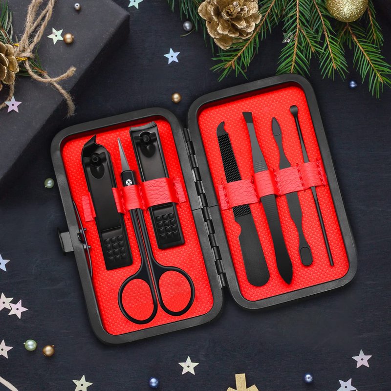 - đ„ăMEN MANICURE SETă Men's nail grooming kit contains 7 tools for nail care, facial care and foot care. Scissors, tweezers, nail file, cuticle pusher, ear pick, straight nail clipper & angled edge nail clipper for fingernail toenail in this nail set can meet all of daily needs!