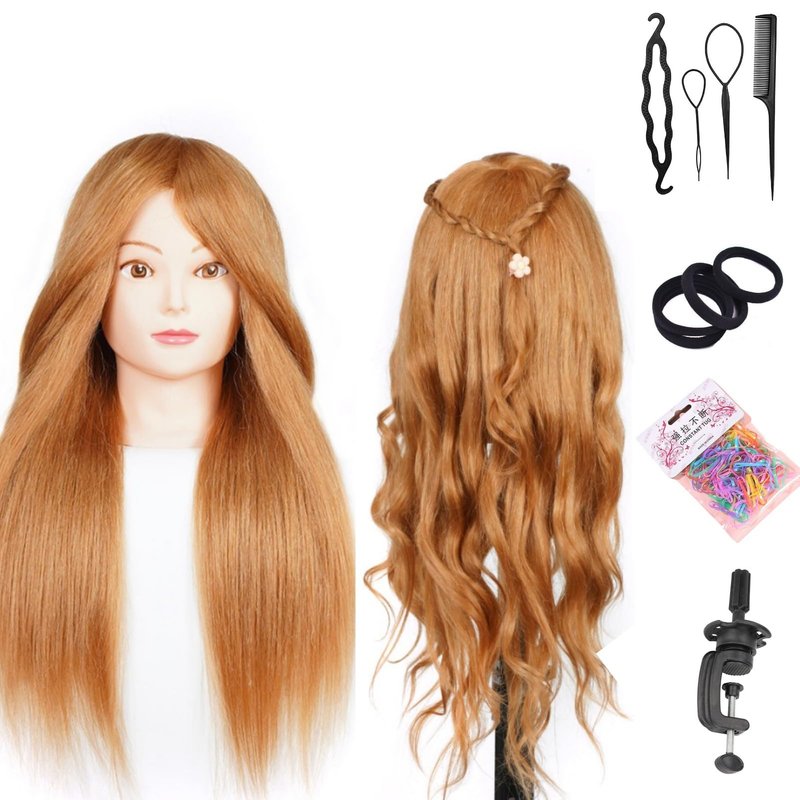Mannequin Head with 60% Real Hair, Hairdresser Practice Training Head Cosmetology Manikin Doll Head with 9 Tools and Desktop Stand, Air Cushion Comb,Makeup On (Golden)