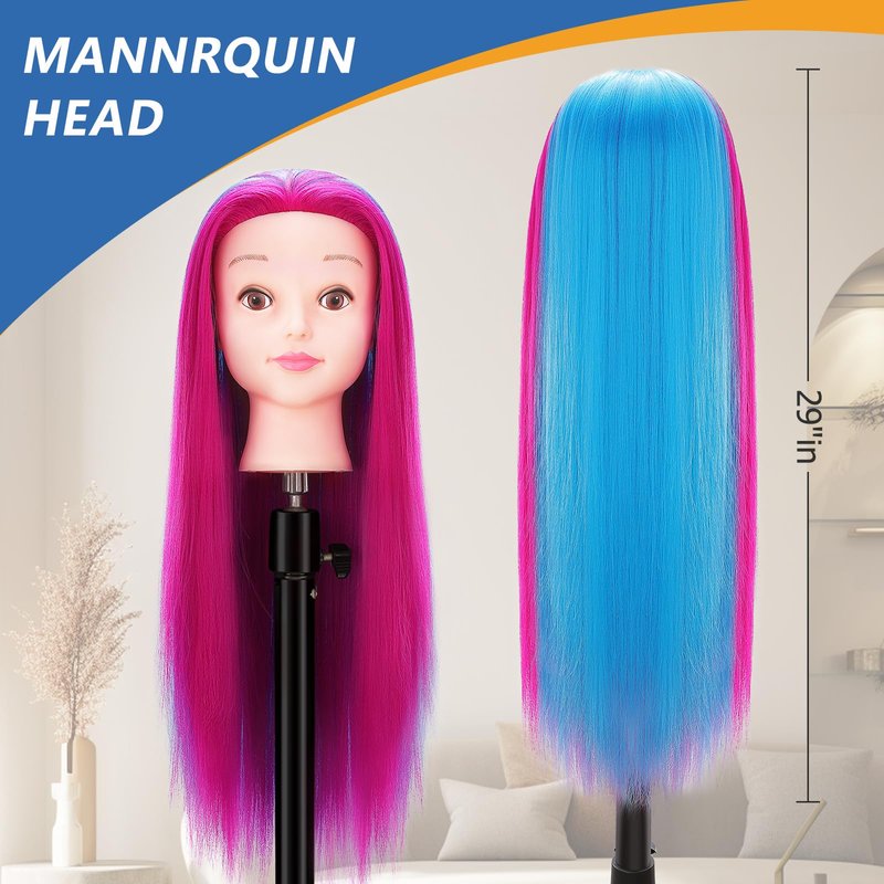 Mannequin Head with Hair, 29" Cosmetology Mannequin Head Manikin Head with Synthetic Fiber Hair Practice Doll Head for Hair Styling Training Braiding with Clamp Holder and Tools