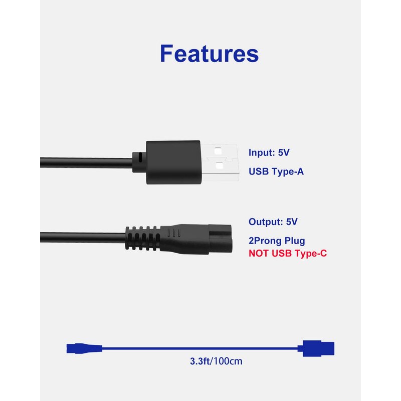 - 【Features】 Input: AC 5V USB Type-A; Output: DC 5V 1A 5W(max) 2 Prong Plug(NOT USB Type-C); Power cord length: 3.3ft/1m. Bend lifespan of more than 6000 times. with 1 Cleaning Brush.