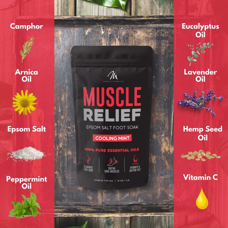 - SOAK AWAY SORENESS- Say bye-bye to sore and achy feet with the Mantello Muscle Relief foot soak. An essential-oils infused foot bath soak formulated to soothe away aches and pains, this foot spa soak is the ultimate way to relieve sore feet.