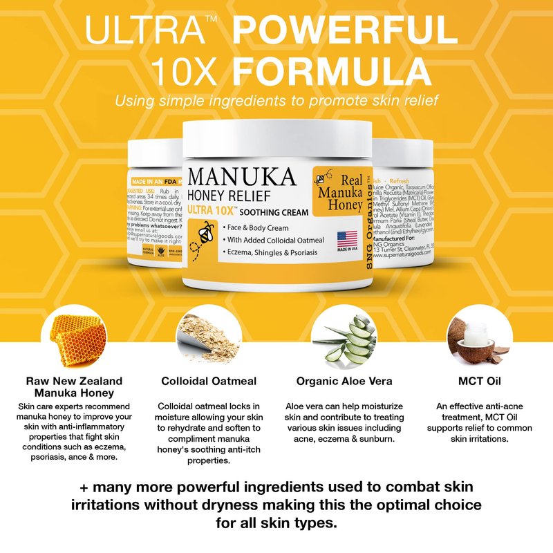 - PREMIUM SKIN THERAPY - Formulated around the ultra soothing properties of Manuka Honey, with the goal of providing natural relief, deep hydration and to promote skin health. Regular use may assist in managing the symptoms associated with dry itchy skin from conditions like eczema, psoriasis, rosacea, acne, and more.
