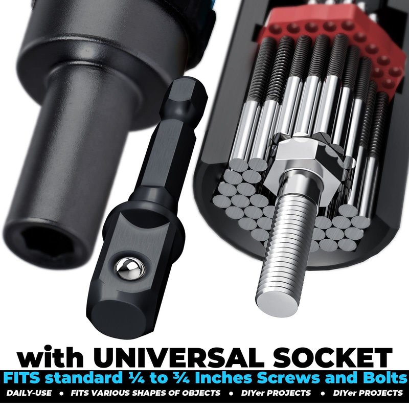 - đăCool Gadgets for MenăThe universal socket is composed of a single hardened steel spring pin, which allows the sleeve to adapt to any shape immediately and grip most nuts, hexagon nuts, square nuts, hexagons, screws, hooks, lag screws, bolts Heads and other strangely shaped fasteners. And it equipped with a power drill adapter, which can connect with most electric drills. Manwald universal socket is perfect for home improvement, construction, carpentry, auto repair, woodwork, and DIYs.