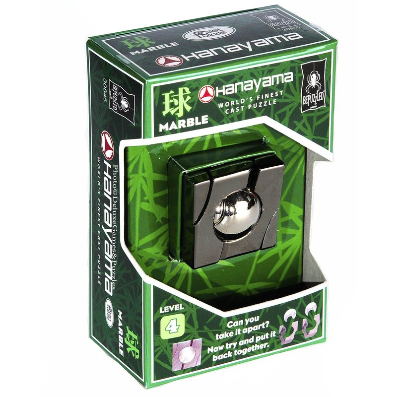 MARBLE Cast Metal Puzzle from Hanayama Puzzles of Japan is both a delightful and tricky brain teaser puzzle. It consists of FOUR pieces which completely separate. The object is to disassemble and assemble back together. Measures approximately 1.25 inches across. This is a really fascinating disentanglement brainteaser. You may find yourself turning the center ball around and around for longer than you planned. Recommended for ages 12 to 105 years. Rated by the manufacturer as a level 4 difficulty (on a scale of 1 to 6 where 6 is the most challenging.) Difficulty level shown on the packaging. Your own experience could vary substantially. MARBLE is part of a series of 55 plus very interesting and mentally provocative metal brain teasers from the Hanayama Puzzle Company. Some serious puzzlers refer to these as "disentanglement-style puzzles" as they involve taking something apart and then re-assembling. Re-assembly can also be a puzzle and may be equally as tricky. Reminder. NO FORCE is ever required to solve the puzzle. Just a series of clever moves. Forcing pieces may damage the puzzle !!