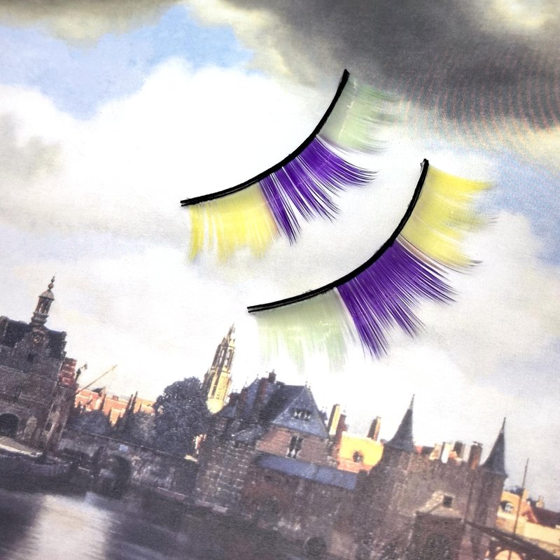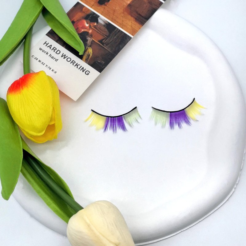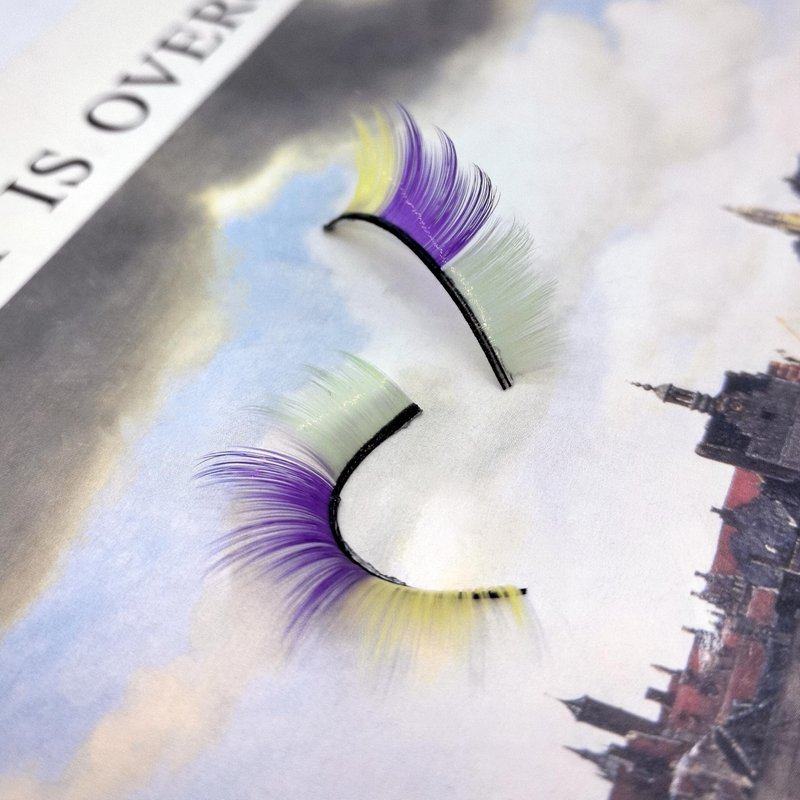 - Festive Purple, Green, & Yellow Style: Featuring a Fuller C-curl design, these lashes incorporate varying density clusters to mimic a salon-quality colored lash extension effect, adding a festive flair to your look.