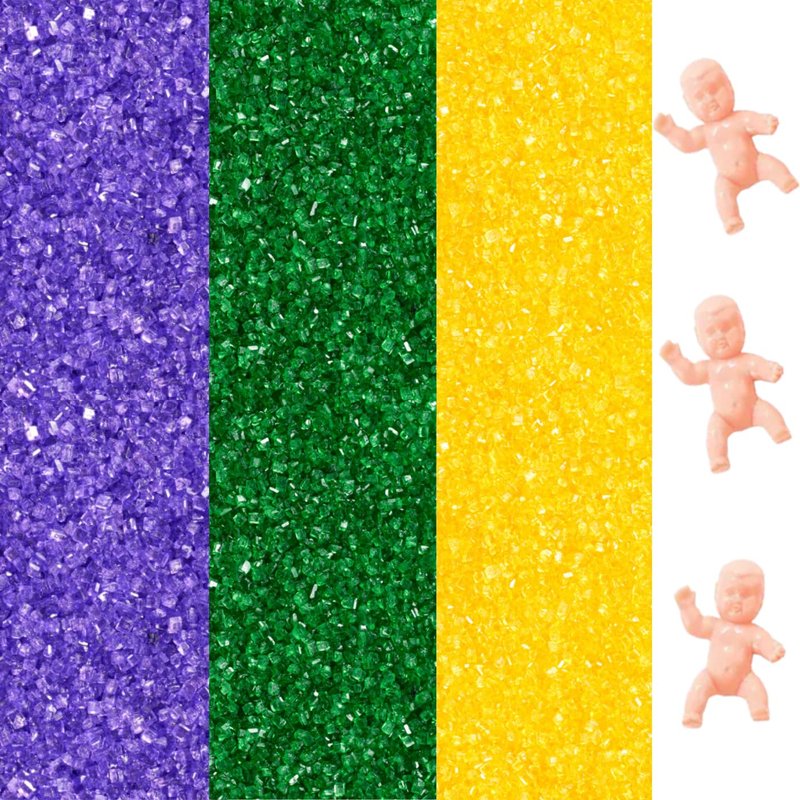 This Sanding Sugar is great for decorating cakes and cupcakes for Birthdays, Parties and other special events. Traditional fat Tuesday tradition! Use your favorite recipe add the included baby and finish with this 3 pack Sanding Sugars (yellow, green, purple) .