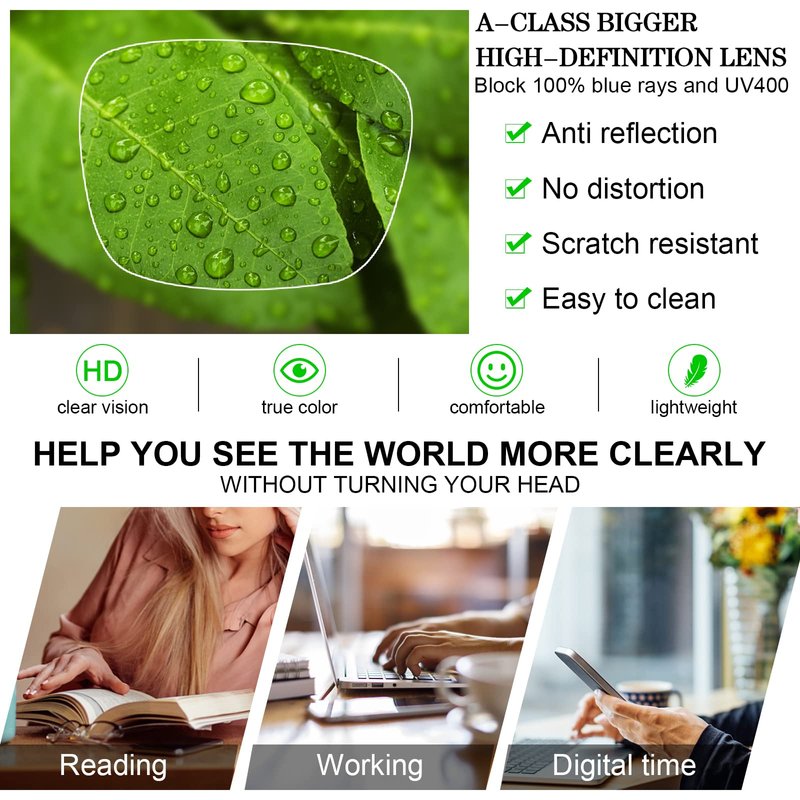 - High definition vision - A-class magnifying glasses for reading has higher precision to read small print easily, good transmittance, reduce reflection & scratch resistant, easy to clean. wide square yellowish tinted reading glasses ensures true color, no blur and or distortion, bigger field of view without turning your neck to easily get a clear vision.