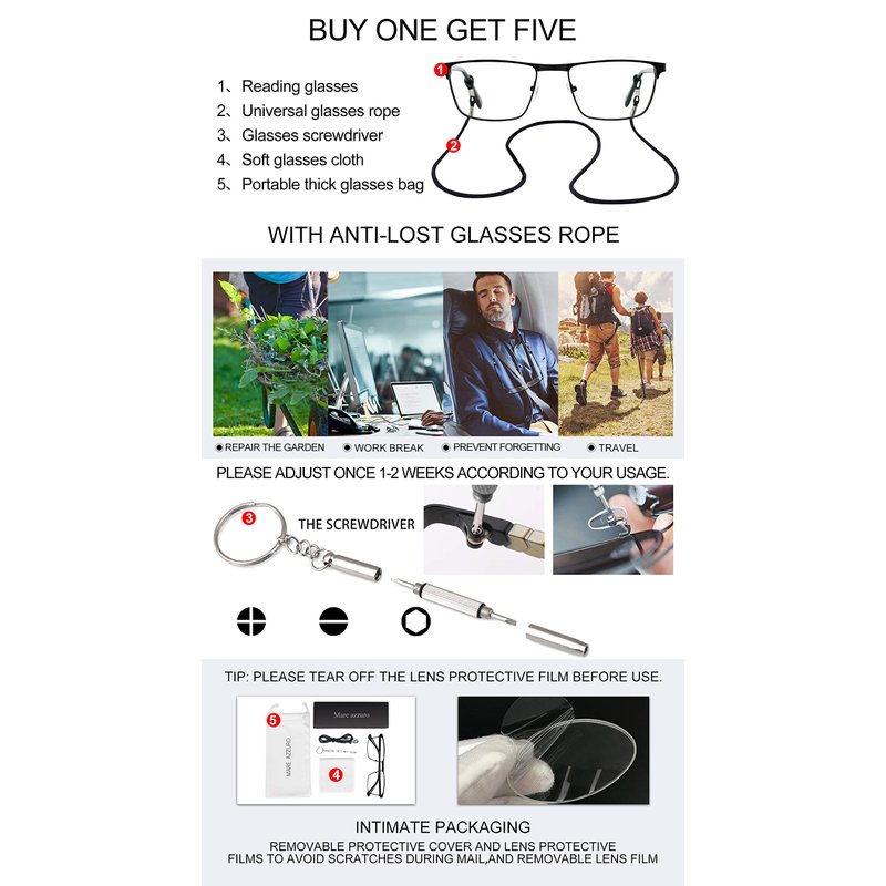 - NO SHOPPING RISK: 1*Reading glasses 100, 1*Glasses cloth & glasses bag(worth $3), 1*Glasses rope(worth $2), 1*Glasses screwdriver(worth $2), 1*Brand packaging box as a beautiful gift. 100% replacement or refund service, if any damage occurs to the product, please contact MARE AZZURO service team to solve the problem quickly and effectively.