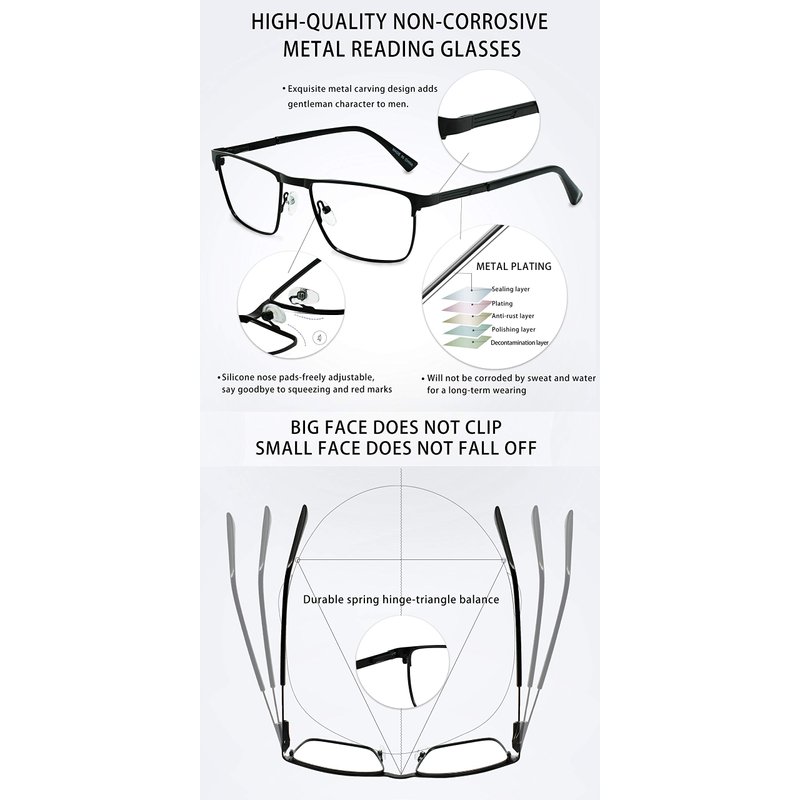 - METAL PLATING CRAFT: Rugged and non-corrosive reading glasses 1.00 men with flexible metal spring hinge, using metal plating technology, will not be rusted by sweat and sea water, will not peel off, can be worn for a long time, durable and comfortable. Simultaneously, The reliefs on the legs designed by Italian designers embellish the gentleman charm.