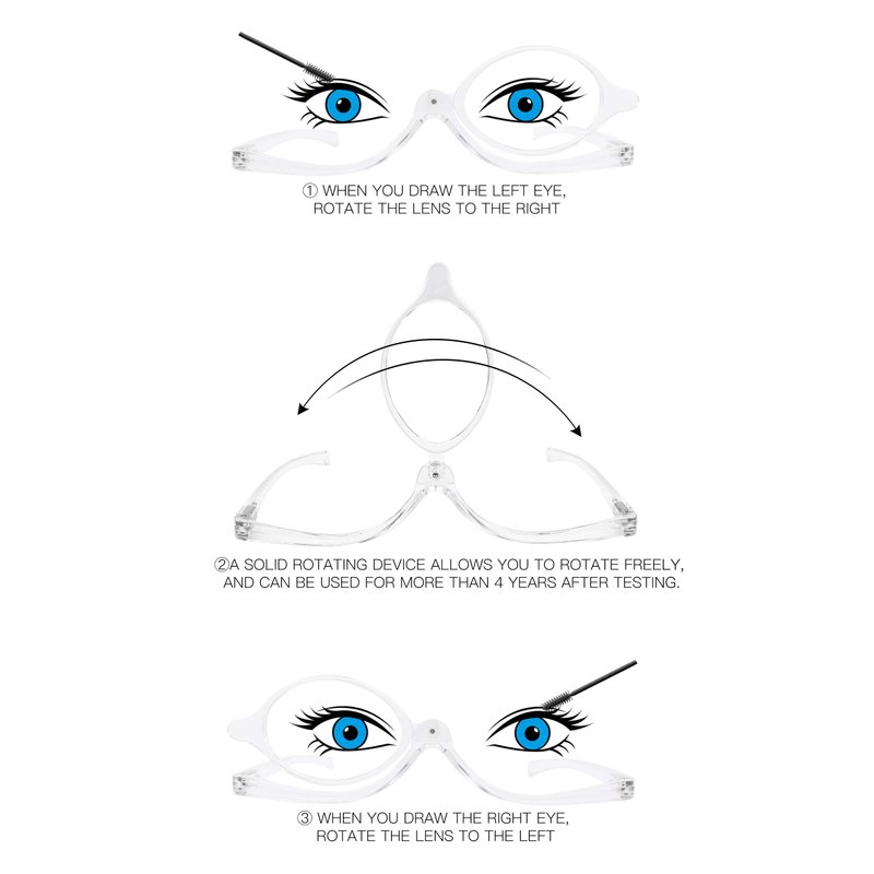 - DESIGNED for MAKEUP: This flip down reading monocle to use cosmetic easy. when you try to masquerade your left eye, you can switch the lens to your right, for right eye switch left. Note: This is only makeup glasses, not daily reading glasses. And please take off the glasses and then switch the lens left and right to avoid damaging the makeup during the rotation.