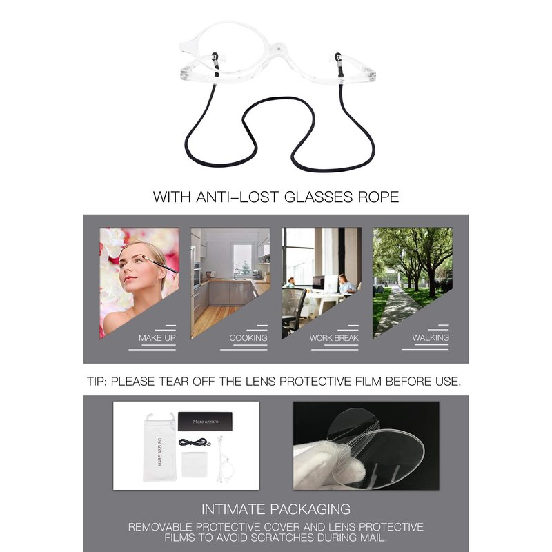 - NO SHOPPING RISK: 1* 1.50 makeup readers, 1*Glasses cloth & glasses bag(worth $3), 1*Glasses rope(worth $2), 1*Brand packaging box as a beautiful gift. 100% replacement or refund service, if any damage occurs to the product, please contact MARE AZZURO service team to solve the problem quickly and effectively.