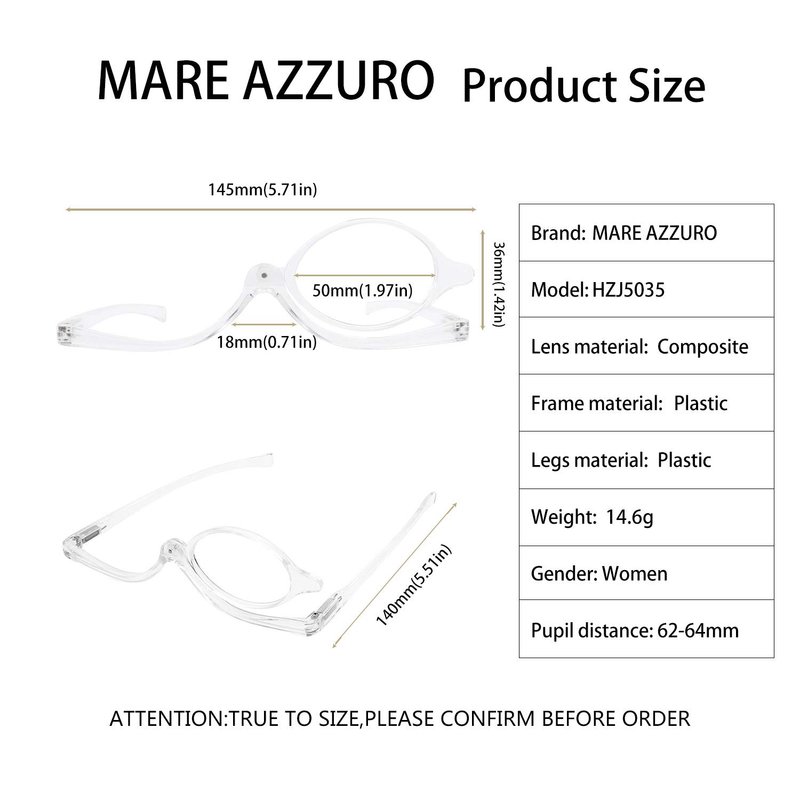 MARE AZZURO Eye Make Up Reading Glasses Women Folding Cosmetic Readers 100 125 150 175 200 225 250 275 300 350 400 500 600 (Transparent, 1.50)