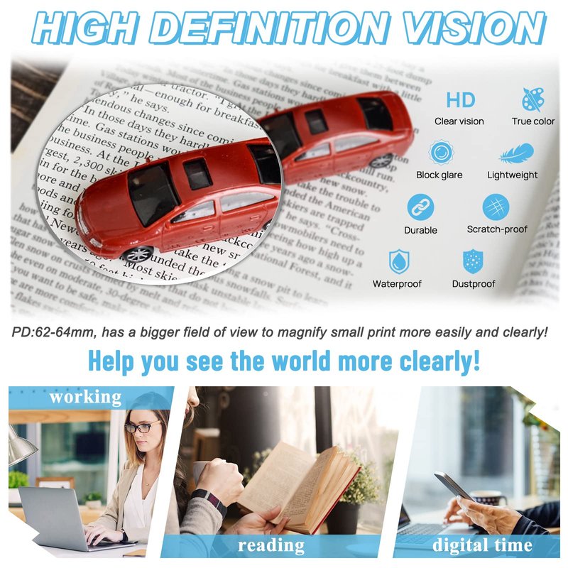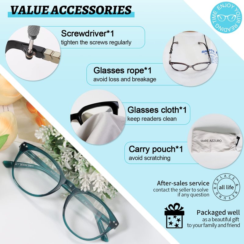 - PACKING&AFTER SALES:Package Included:1*reading glasses,1*glasses cleaning cloth (worth $1),1*black glasses bag (worth $2,to avoid the lens being scratched and easy to carry without taking up space),1*Black original packaging box as a beautiful gift.In case of any problems within 30 days, please contact with our customer services without hesitation.You have no risk to try!