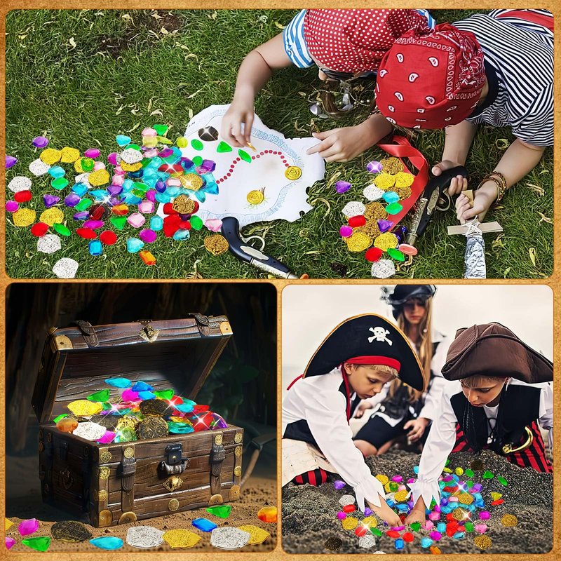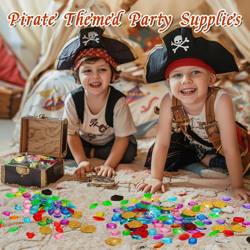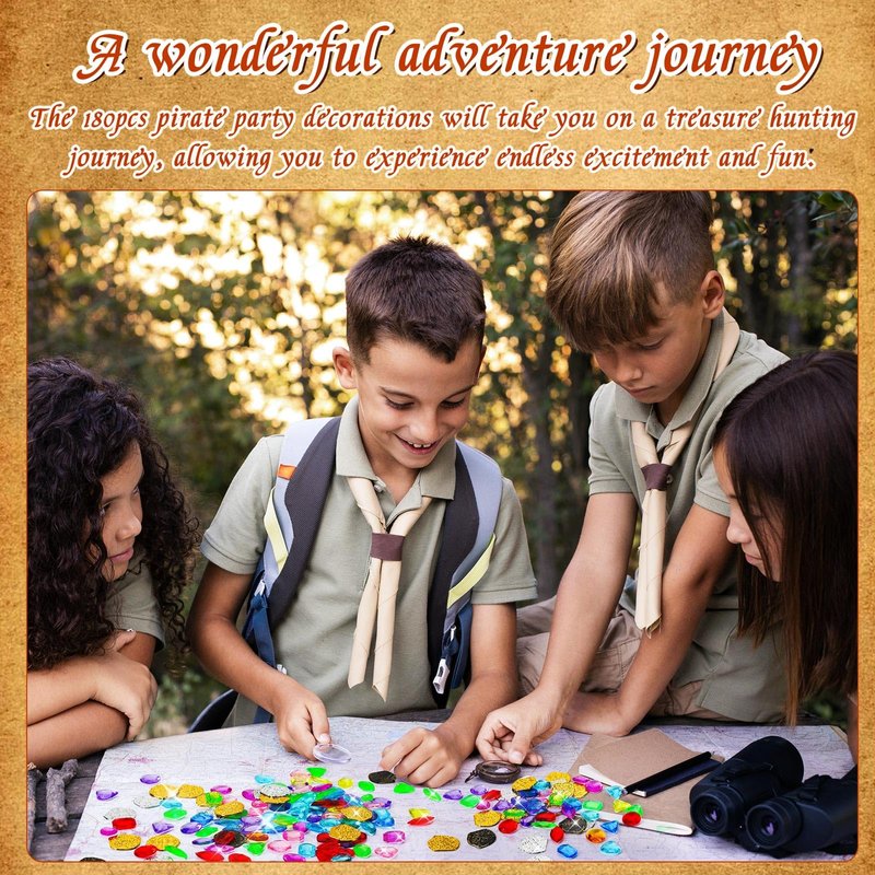 The 180pcs pirate party decorations will take you on a treasure hunting journey, allowing you to experience endless excitement and fun. The treasure chest pirate set includes 60pcs of gold, silver, retro plastic coins, as well as 120pcs of colorful dive gems with 8 styles. Each plastic gems has a unique style and shape, emitting a mysterious light, as if hiding endless treasure secrets. Fake coins are made of good-quality plastic materials, with a realistic feel and are not easily deformed or damaged. The dive gems are made of good-quality acrylic materials, which are crystal clear and have vivid colors. Whether used as precious treasures in role-playing games or as decorative embellishments, the pirate party supplies can instantly enhance the visual effect. The treasure chest pirate set is not only a toy, but also a tool to stimulate children's creativity and imagination. Parents can organize pirate treasure hunting activities with their children to increase interaction and communication between parents and children, deepen family relationships, and allow children to experience the excitement and fun of the pirate world. This pirate treasure set can not only be used as a toy for kids, but also an ideal gift. Whether as a birthday or Christmas gift, or as a reward or surprise, the 180pcs pirate party supplies are the ideal choice. Pirate party decorations will bring joy and surprise, allowing you to experience the joy of exploration. The pirate party decorations set will become an ideal companion for people to play and learn, accompanying you through happy times.