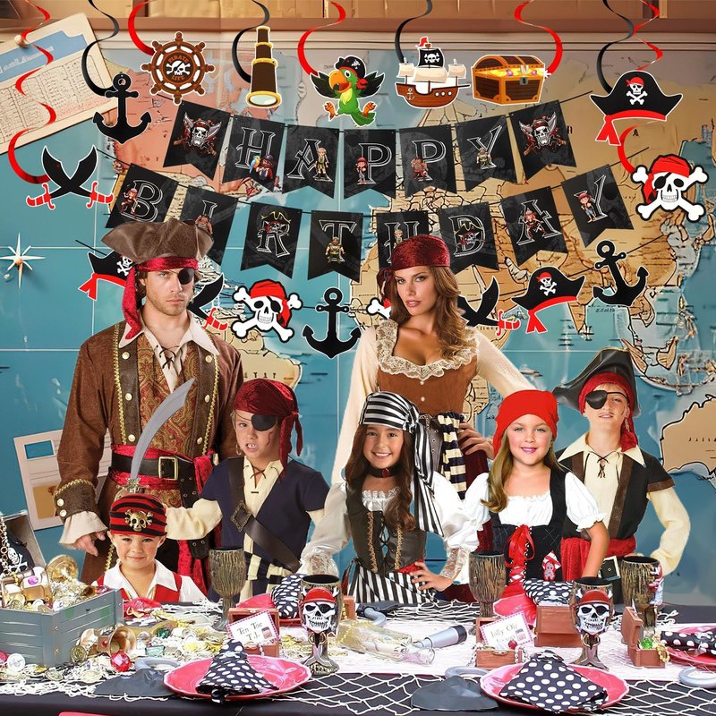- Pirate Theme Birthday: The pirate decorations take pirates as the theme, including classic elements such as anchor, skull, treasure chest, wheel, telescope, pirate sword, and the words "Happy Birthday", which makes your theme party both personalized and warm