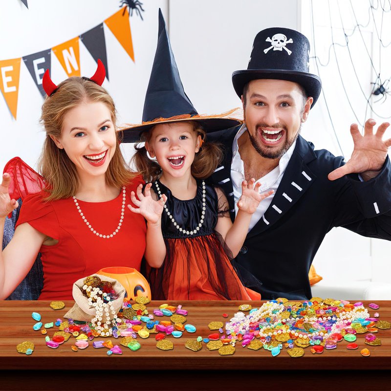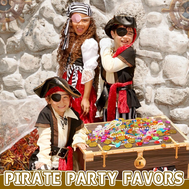 Pirate Pirate Party Supplies Set In this pirate party decorations set, you will get an ideal pirate party gift, which includes: Pirate Gold Coins: 50 irregular round gold coins with special marks, which make your pirate party decorations more pirate-like. Gemstone Set: Contains 190 plastic gems, which are cut into various gem shapes, emitting shiny and translucent luster. Pearl Necklace: 5 strings of exquisite pearl necklaces add elegance and exquisiteness to your party. Drawstring Bag: a practical drawstring bag, which is convenient for carrying and storing these precious pirate treasure. Size and Material The size of pirate treasure cions is about 3.5 cm /1.4 inch, which is suitable for decoration in various occasions. The size of dive gems is about 1.5-3cm /0.6-1.2 inch, which is appropriate and suitable for children to play and decorate. The circumference of good-quality plastic pearls is about 31.5 inches /80 cm, which is soft and suitable for wearing. Handicraft Gem These pirate party supplies are not only suitable for party decoration, but can also be used to make birthday gifts, treasure boxes, vase fillers, gift bag fillers, sensory box fillers, etc to give play to your creative imagination! Multiple Applications Whether for a Halloween party, a pirate party, a birthday party, stage props, pool games, beach games, class prizes, or even home decorations and wedding table centerpieces, these pirate party decorations can add infinite fun and surprises to your occasion! Please note that these pirate treasure are not suitable for children under 3 years old. It is recommended to use the pirate party supplies with the supervisor of the adult. Come and buy our pirate party decorations set to make your party glow with new vitality and charm!