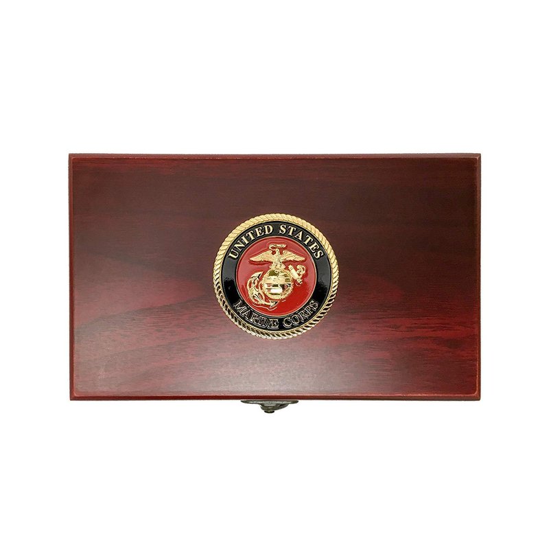 - PERFECT FOR GAME NIGHT: Set includes two decks of cards and five EGA-marked translucent Marine Corps dice. Perfect for your poker or game night. The wooden box features a beautiful a 3D Metal USMC EGA emblem.