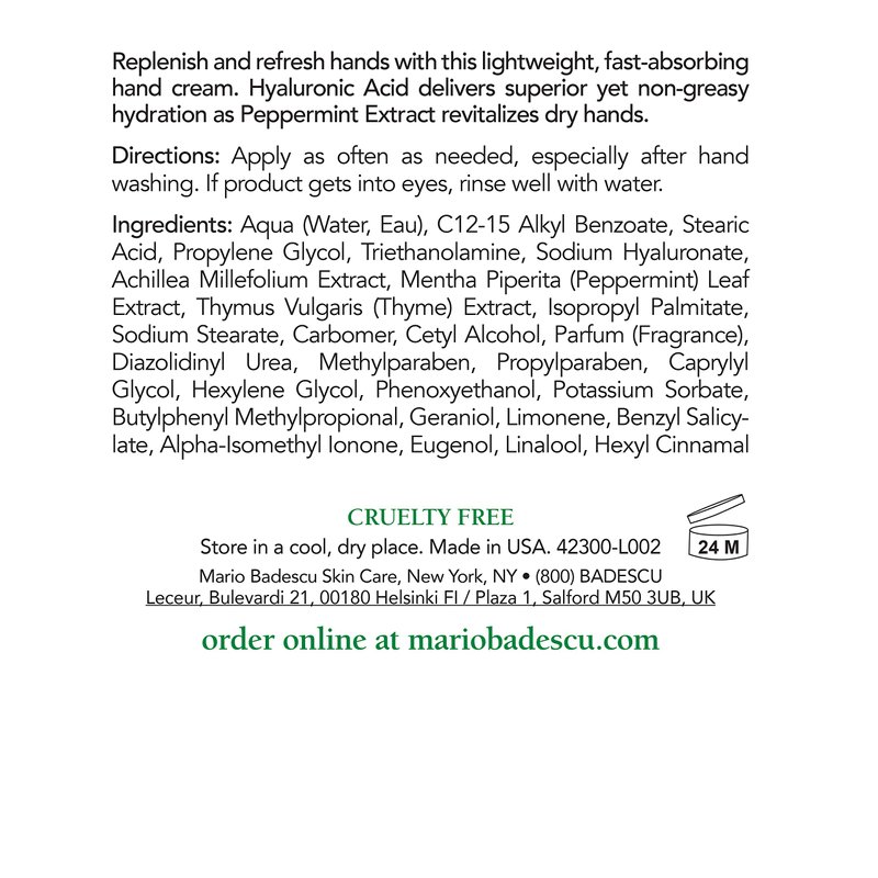 Mario Badescu Hydrating Hand Cream for Dry Cracked Hands - Hand Care Infused with Revitalizing Peppermint - Absorbs Quickly, Non-Greasy and Delivers Lightweight Hydration, 4 Fl Oz