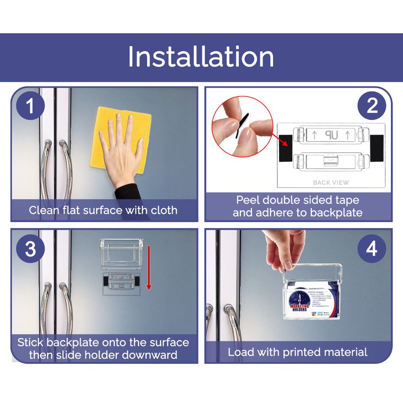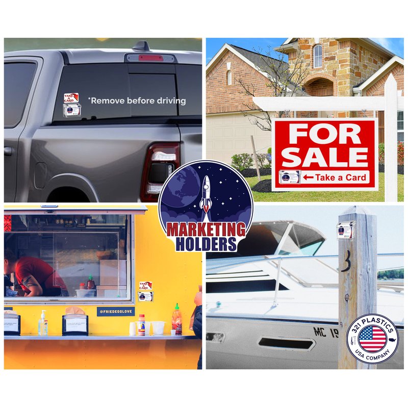 Grab A Card Stick On Clear Outdoor Vehicle Business Card Holder Product Features: Holds standard sized business cards or other 3.5”W x 2”H printed material Inner Dimensions: 3.5"W x .75"D x 1.5"H Overall Dimensions: 4.25”W x 1.25”D x 2.75”H Includes: Grab A Card Business Card Holder, one "Take One" sticker and a detachable mounting plate with adhesive tape pads Perfect business on the go single pocket exterior business card display holder Proudly made with premium high quality materials Have you ever walked by or drove by a vehicle and tried to remember the information painted on the side? What about all those people who pass by your vehicle trying to remember your phone number, website or even your company name? Few people can remember information displayed on vehicles. Marketing Holders heavy duty outdoor business card holders make distributing your contact information so simple! These card boxes make sure you never miss out on advertising your company. The grab a card display showcases standard sized business cards and comes with a “Take A Card” sticker making it easy for customers to grab a card. Market while running errands and never miss the opportunity to gain new business by attaching one of these on your parked company car or service vehicle. Many businesses such as real estate agents, contractors, electricians, and plumbers have attached these on outdoor signs, business or store entrances. This outdoor marketing card bin is an inexpensive and effortless way to market your business, no matter what industry you're in! These outdoor advertising bins have lids that provide extra protection for your business cards. They are weather resistant and durable, making them perfect to withstand the elements. The outdoor calling card holder comes with a detachable mounting plate and adhesive tape pads for quick and easy mounting to smooth surfaces. *All sizes are approximate