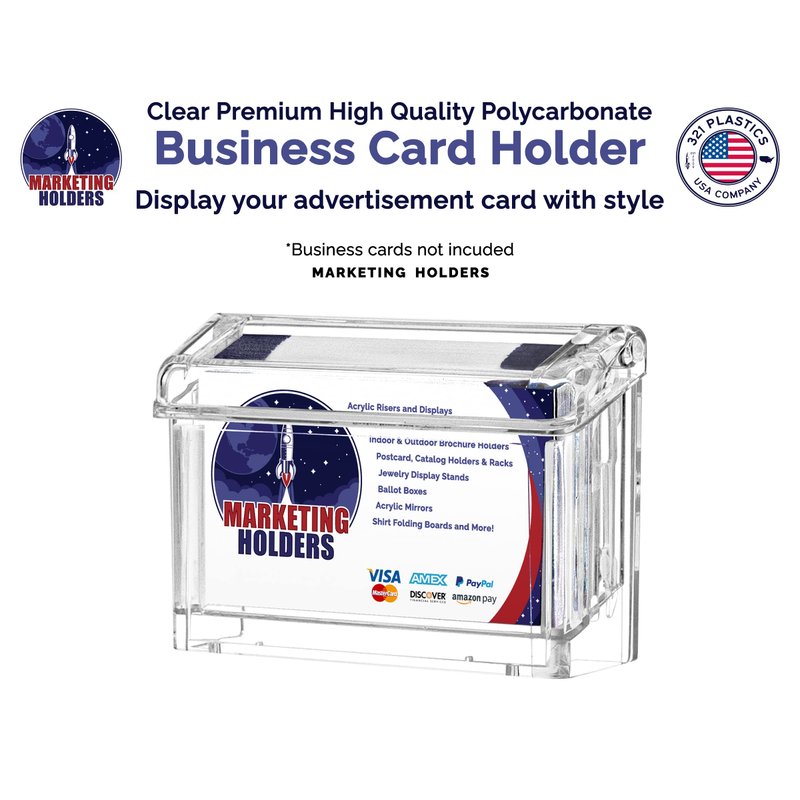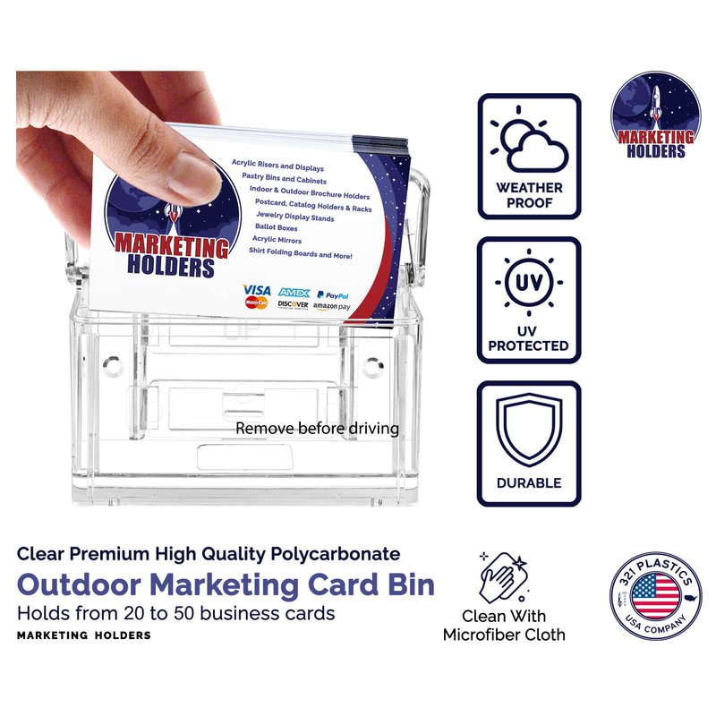 - Marketing Holders heavy duty outdoor business card holders make distributing your contact information so simple! These card boxes make sure you never miss out on advertising your company. The grab a card display showcases standard sized business cards and comes with a “Take A Card” sticker making it easy for customers to grab a card.