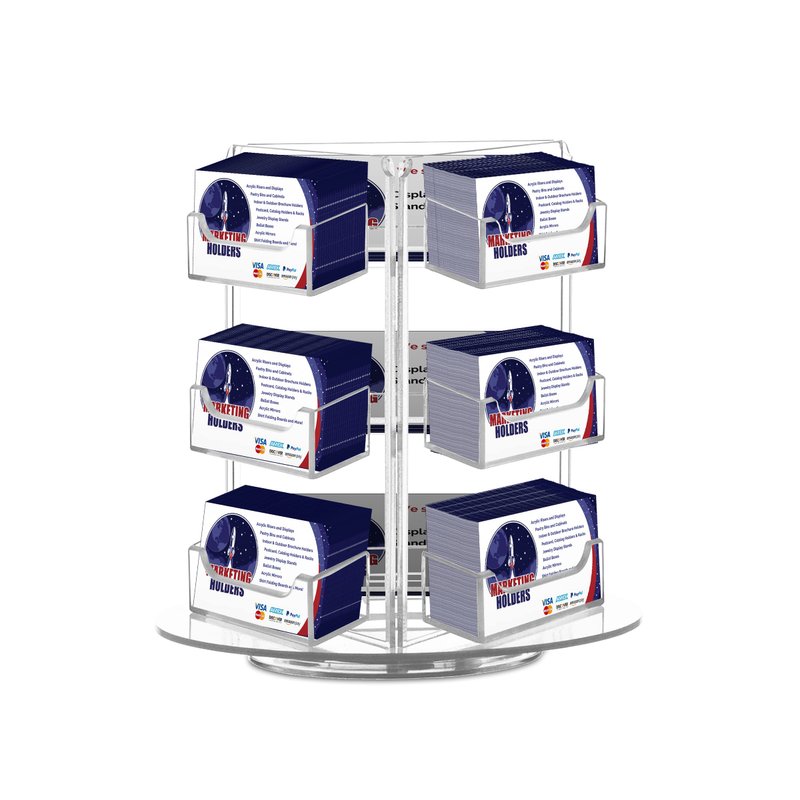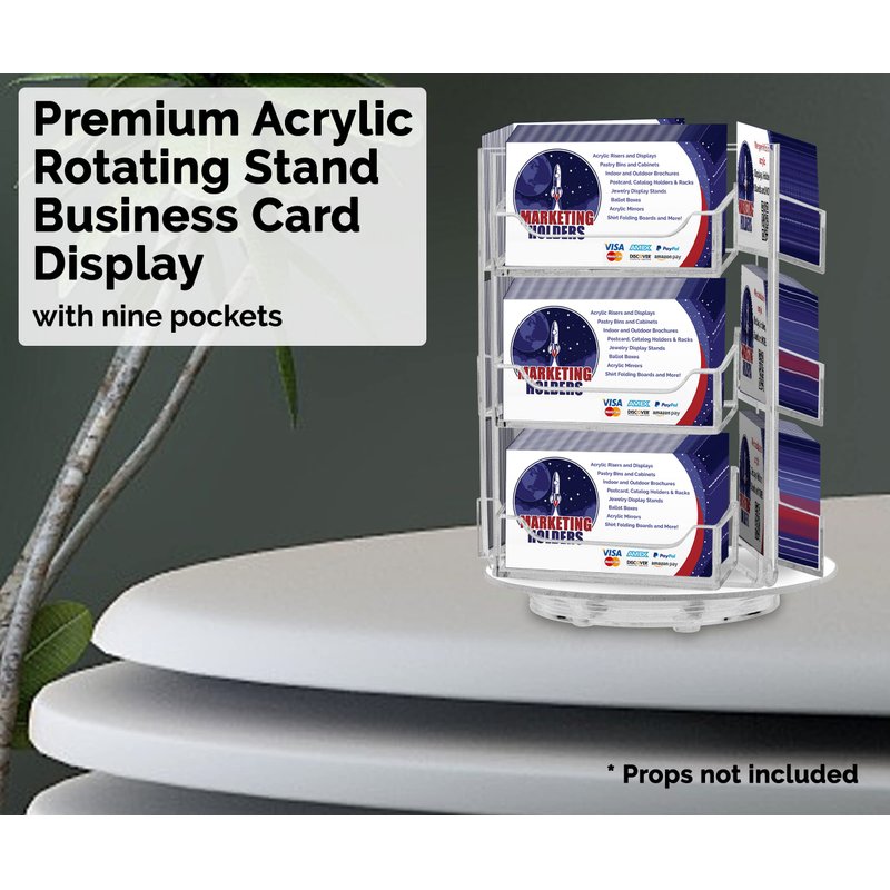 Holds 3.5”W x 2”H standard sized business cards, appointment, membership, gift or rewards cards Overall Dimensions: 6"W x 8"H Pocket Dimensions: 3.5”W x 2"H x .75”D Perfect display solution for business cards and gift cards Space-saving design displays nine sets of cards in one convenient holder Freestanding and portable; display on top of a table or on counters and desks This clear spinning multi pocket freestanding business card holder is designed to hold multiple cards at once in one convenient place. These spinner stands will help keep the counters, tables and desk free of clutter and easily accessible to all customers or patients to easily take one. Each pocket will hold any 3.5”W x 2”H printed material. Made of durable clear acrylic plastic. This plastic acrylic rotating display stand is perfect for multi agent offices or entrepreneurs who need to promote their business on numerous tables or counters. The holder allows you to display your information in a clear and easily accessible manner, these are great for placement in any service business, salons, reception areas, professional office, government office and other various venues such as trade shows, flea markets or expos. In addition to business information, the acrylic holders can also be used to display other small media like Security Gate Code Cards, Membership Cards, Appointment Cards, VIP Cards, ID Badges, Security Cards or Gift Cards. Store credit cards are often placed in the cases near the register or checkout stand to increase clientele and expand the customer base. Other times, simple gift cards or doctor’s appointment cards are placed in the pockets. *All sizes are approximate