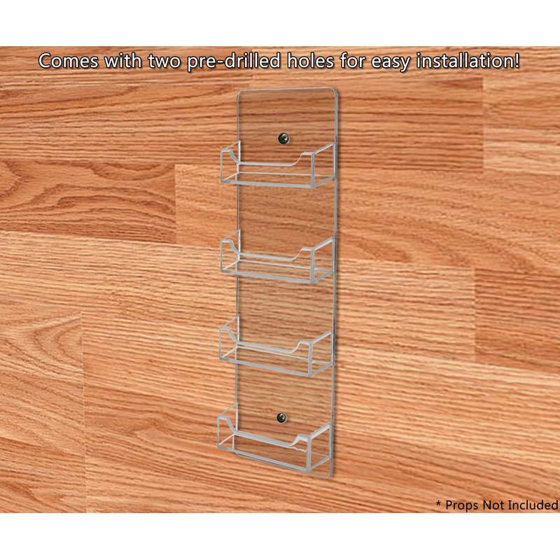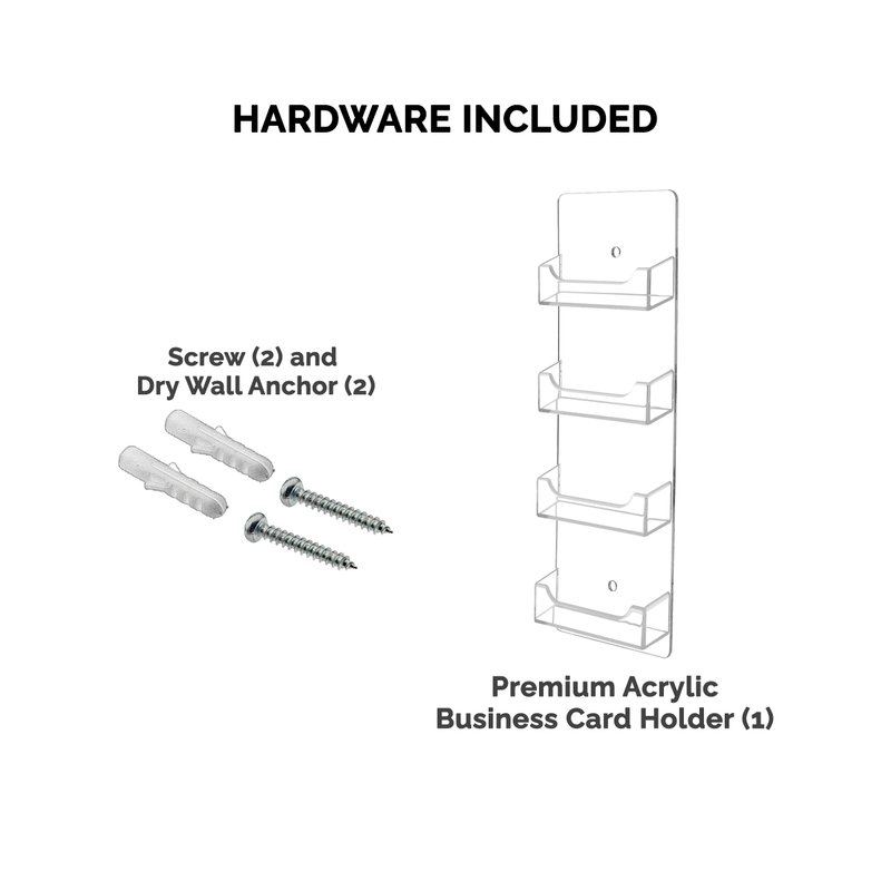 4 Pocket Gift Business Card Display Wall Rack Retail Office Product Features: Holds 3.5”W x 2”H standard sized business cards, appointment, membership, gift or rewards cards. Pocket Dimensions: 3.5”W x 2"H x 1”D. Overall Dimensions: 4.25"W x 10.5"H x 1"D. Pocket Capacity: 50 standard business cards or 30 gift cards. Perfect space saving multi pocket wall mount display holder with pre drilled holes and hanging hardware. This extra capacity 4 pocket space saving wall mount business card holder provides a sturdy display for business, gift or appointment cards that complements any decor. These multi slot card racks are great space savers and help you keep counters free and clear of clutter. Looking for a convenient way to distribute multiple sets of cards in one convenient card organizer rack? Business card holders make spreading the word on the multiple sets of cards simple and easy to access and still appear professional. Just one holder to display multiple sets of printed material and help keep the clutter to a minimum. The appointment card display rack has a design that makes it easy for clients and potential customers to take one. Each pocket can hold up to 50 standard business cards so you will not have to fill them that often. This gift card showcase display is made with acrylic plastic material and made right here in the USA. The wall card rack provides long-term durability in addition to keeping your 3.5 inch by 2 inch printed material neatly in the holder, and can be easily placed on any wall by exits or entrances. We have designed these to display several sets of business cards and can be conveniently placed on walls or anywhere you want to leave your calling cards for the taking. These card holders come pre-drilled for easy hanging and includes hardware. All sizes are approximate. Under no circumstances are we responsible for any actions involving hanging products using self purchased or provided hardware.