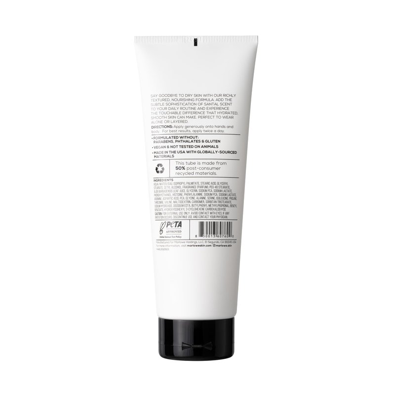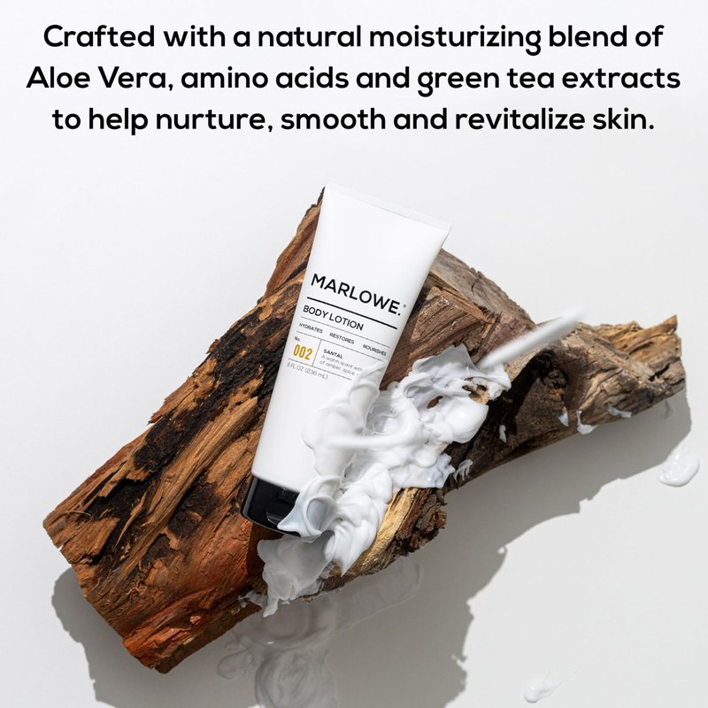 MARLOWE. 002 Santal Body Lotion, Moisturizing Daily Dry Skin Lotion Experience luxury grooming made simple with the MARLOWE. Santal Body Lotion. This premium body lotion absorbs quickly, helping to deliver deep hydration without any greasy residue, transforming your grooming routine into an invigorating ritual featuring our signature Santal scent – an elevated blend of warm sandalwood, rich amber, and bright citron that evolves beautifully throughout the day. Made with a moisturizing blend of Aloe Vera and green tea extracts, our body lotion is designed to help nurture, smooth and revitalize skin. This oil free body lotion gently nourishes the skin and is Santal scented with warm undertones of spice and layers of amber with a hint of citron. For best results, use twice daily. MARLOWE. delivers powerful skincare and grooming without compromise. We formulate without harsh chemicals like phthalates, SLS/SLES, and parabens, giving you clean results you can trust. Made in the USA from premium global ingredients, our vegan, cruelty-free products prove that effective skincare doesn't need to be complicated