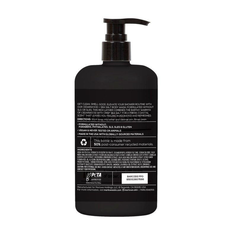 MARLOWE. No. 103 Cedarwood + Sea Salt Body Wash Experience luxury grooming made simple with the MARLOWE. Cedarwood + Sea Salt Body Wash. This premium body wash delivers a daily dose of freshness, transforming your grooming routine into an energizing ritual featuring an earthy warm scent of cedarwood, sage, and sea salt, that will leave you smelling amazing. Our moisturizing blend of antioxidants and extracts of willow bark and green tea is designed to nourish, smooth and revitalize skin. The invigoratong scent with a refreshing burst of zesty lemon, crisp salted sea air, fresh sage, and warm amber balanced with cedarwood keeps you feeling revitalized all day long. A few pumps in the shower are all you need to lather from head to toe with our moisturizing foaming body wash. MARLOWE. delivers powerful skincare and grooming without compromise. We formulate without harsh chemicals like phthalates, SLS/SLES, and parabens, giving you clean results you can trust. Made in the USA from premium global ingredients, our vegan, cruelty-free products prove that effective skincare doesn't need to be complicated