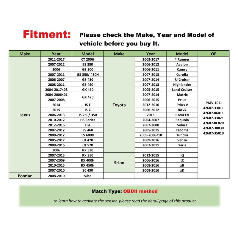 - Application for Toyota: The sensors fit for 2003-2017 for 4 Runner, 2006-2012 for Avalon, 2006-2011 for Camry, 2007-2013 for Corolla, 2007-2014 for FJ Cruiser, 2007-2013 for Highlander, 2005-2015 for Land Cruiser, 2007-2014 for Matrix, 2006-2015 for Prius, 2012-2016 for Prius V, 2006-2012 for RAV4, 2013 for RAV4 EV, 2004-2007 for Sequoia, 2007-2008 for Solara, 2005-2015 for Tacoma, 2005-2006<10 for Tundra, 2009-2016 for Venza, 2007-2011 for Yaris