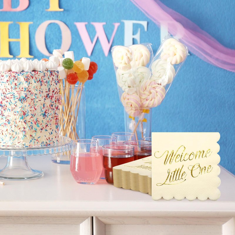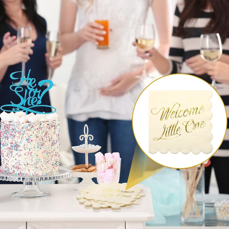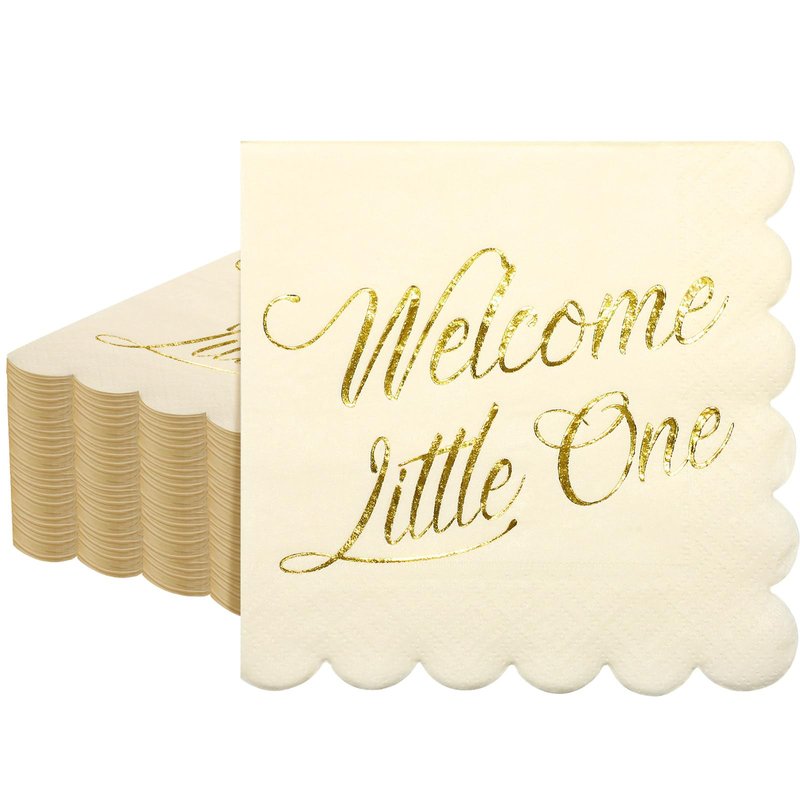 - Elegant Design: printed with a welcoming gold foil script that reads 'Welcome Little One' to show the love and care for the newborn, our light tan scalloped napkins exude an elegant charm that adds a touch of class to your baby shower event