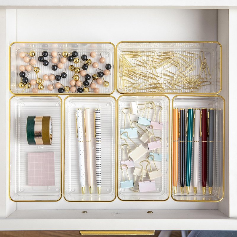Martha Stewart Kerry Plastic Stackable Office Desk Drawer Organizers, 6" x 3", 6 Pack, with Gold Trim