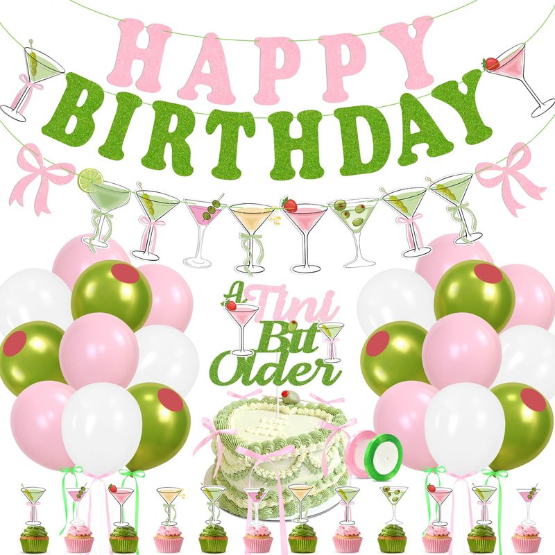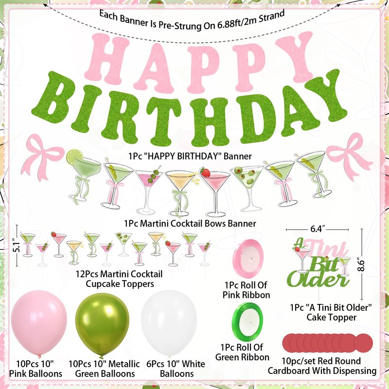 - Unique Design for Martini - Party Decorations kit includes: 1Pc Martini "Happy Birthday" Banner, 1Pc Martini Cocktail Bows Banner, 1Pc "A Tini Bit Older" Cake Topper, 12Pcs Martini Cocktail Cupcake Toppers, 26Pcs balloons, 1Pc Roll Of Pink Ribbon, 1Pc Roll Of Green Ribbon, 10pc/set Red Round Cardboard With Dispensing. These martini themed party decor will be a perfect highlight, party favor or centerpiece for your event. swoon!