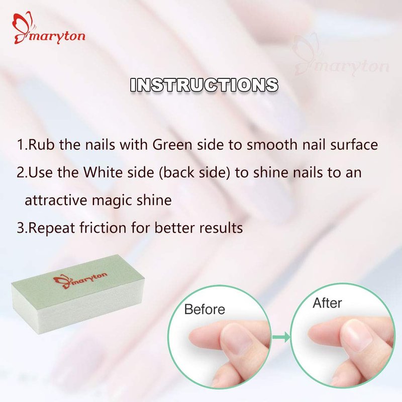 - Easy to Use – Get a smooth glass-shine in seconds! To make your natural nails shiny, just need two steps. First, use the GREEN side to smooth and even out nail surface; Second, use the WHITE side to shine nails to an attractive magic shine
