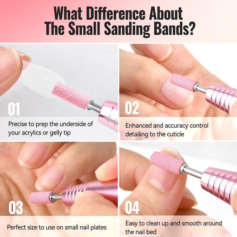 - Precision Nail Shaping – Maryton small sanding bands and small mandrel bits are specifically designed for precise and detailed nail shaping, ensuring optimal finesse when preparing the underside of gel. Whether it’s filing the edges, removing excess length, or shaping the surface of the nails, this set provides the necessary precision and control.