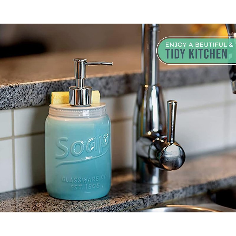 Mason Jar Kitchen Soap Dispenser & Sponge Holder - Sink Organizer - 14oz Kitchen Counter Liquid Soap Dispenser with Stainless Steel Pump, Blue Ceramic Soap Holder w/Free Sponge