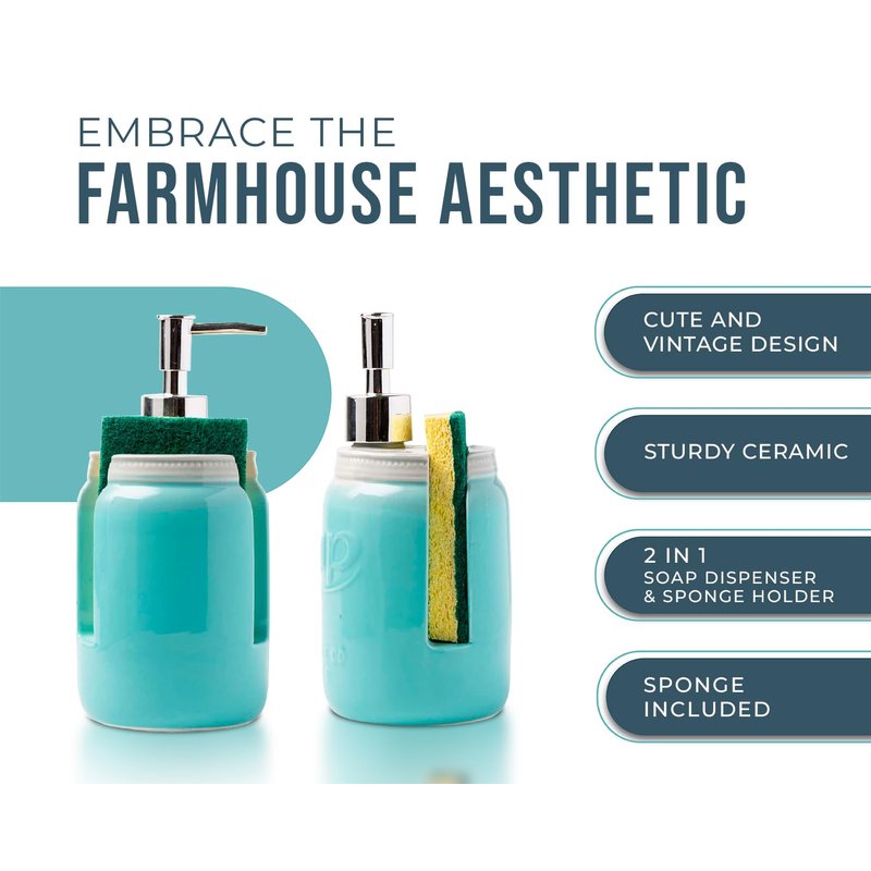- Decorative soap dispenser & sponge holder: Keeping your kitchen nice and tidy is no easy job to do, so we thought we could give you a hand by creating a kitchen product that will save you space and keep everything where it’s supposed to be. 7.5" Height and 3.75" Width.