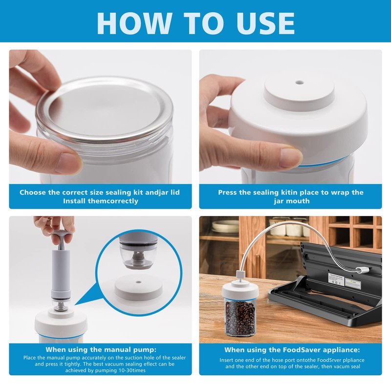 - 【Manual +Automatic Perfect Combination 】-Jar vacuum sealer for mason jar is equipped with a manual vacuum pump.If you don't have a FoodSaver vacuum sealer,Is the FoodSaver vacuum sealer machine too big to carry around on a trip or picnic? Don't worry! you can use a hand pump, which will pump out the air in the mason jar