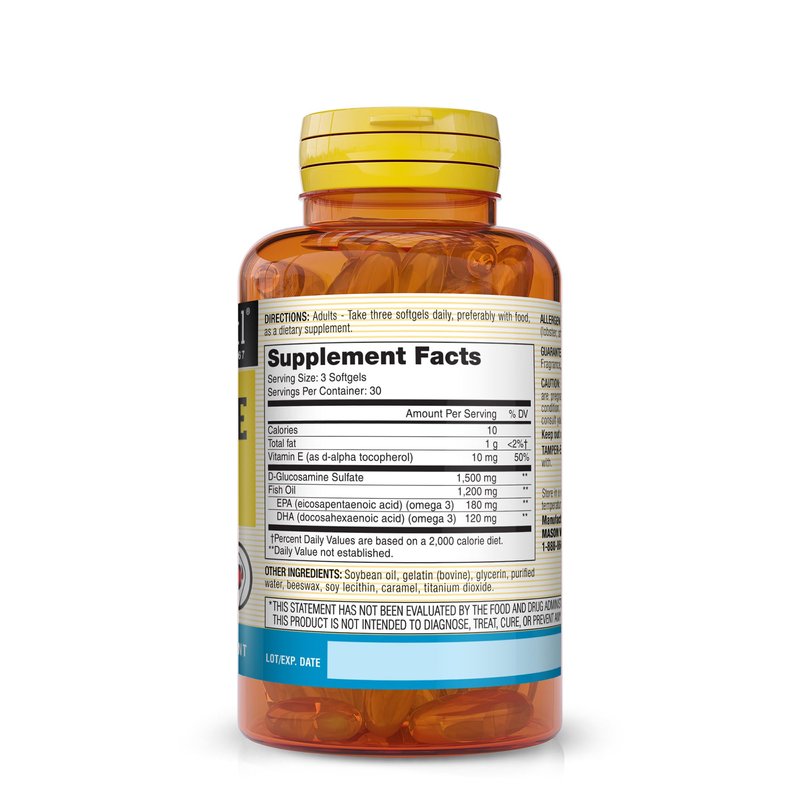 - GLUCOSAMINE & FISH OIL: 1,500 mg of D-Glucosamine Sulfate and 1,200 mg of Fish Oil with 180 mg of EPA and 120 mg of DHA Omega 3s