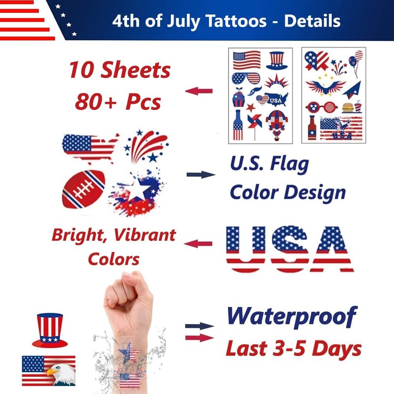 - 🎈 Putting Fake Tattoos on your face, arms and other parts of your body can be a great way to add a patriotic touch to your 4th of July decorations