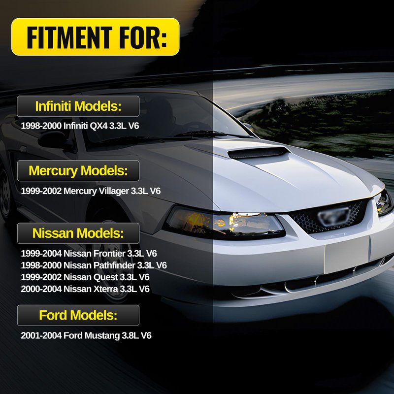 Note: Please ensure compatibility with your vehicle's specific year, make and model before purchasing.Fitment: 1998-2000 Infiniti QX4 3.3L V6 1999-2002 Mercury Villager 3.3L V6 1999-2004 Nissan Frontier 3.3L V6 1998-2000 Nissan Pathfinder 3.3L V6 1999-2002 Nissan Quest 3.3L V6 2000-2004 Nissan Xterra 3.3L V6 2001-2004 Ford Mustang 3.8L V6