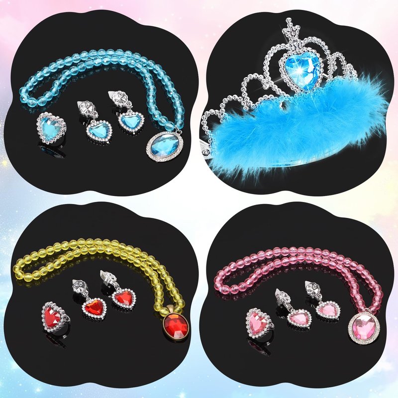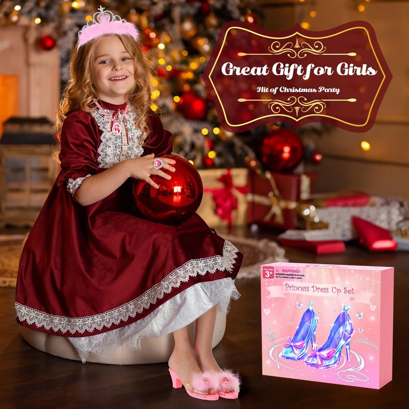 - Toddler Dress Up Gift Set - Princess shoes set includes 3 pairs dress up shoes for toddler girls, 3 crowns, 3 jewelry sets in different colors, including Necklace, Earrings and Rings. Comes with a beautiful box, great gift choice for girls 3-6 years.