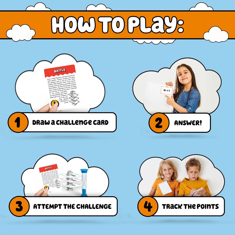 - How to play: Draw a Challenge Card, complete the challenge, and solve the math equation before time runs out; earn points to win; categories include Solo, Battle, Partner, and 1 vs 1 challenges; fast-paced and exciting.