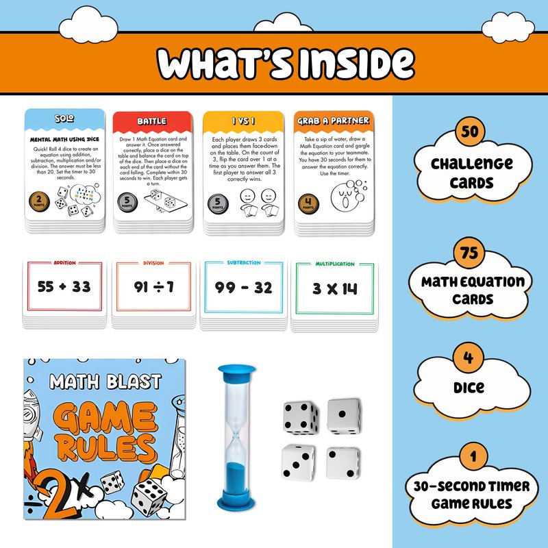 - Includes essential components: 50 Challenge Cards, 75 Math Equation Cards (20 Addition, 20 Subtraction, 15 Division, 20 Multiplication), 30-second Sand Timer, 4 Dice, and Game Rules; ideal for an educational multiplication game.