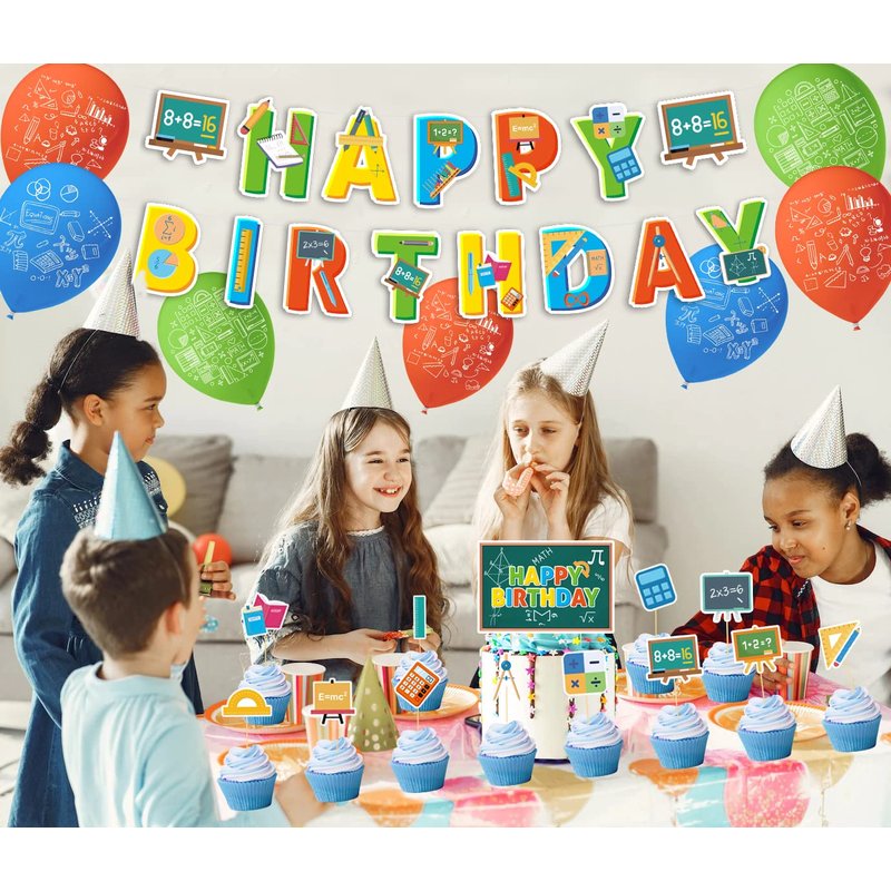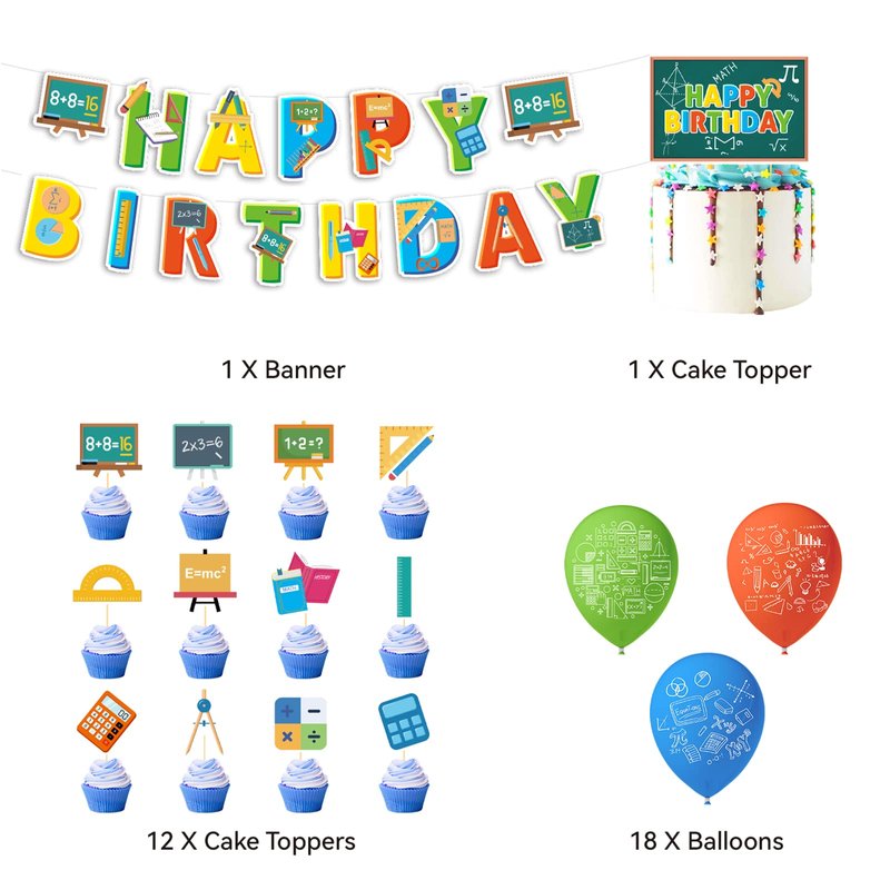 - Math Party Decorations: Package includes 1* math HAPPY BIRTHDAY banner, 1*math HAPPY BIRTHDAY cake topper, 12* math theme cupcake toppers, 18* math balloons.