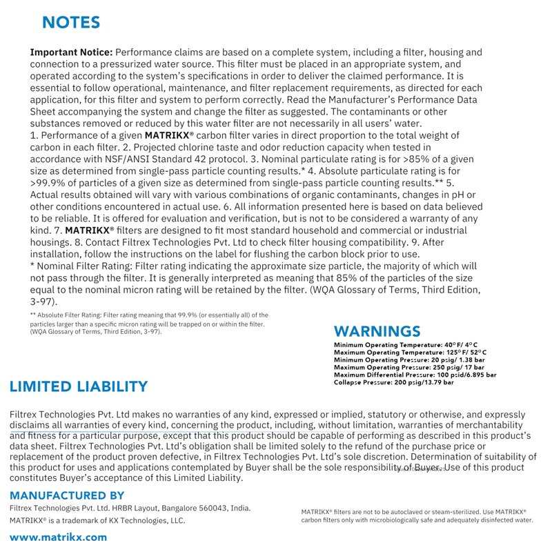 Carbon Block Filter 2.5inch x 10inchMinimum Operating Temp 40 FMaximum Operating Temp 125 FMinimum Operating Pressure 20 psiMaximum Operating Pressure 250 psi (normally depends on maximum of housing)Maximum Differential Pressure 100 psiCollapse Pressure 200 psiThe filter media is made from processed coconut shells. Manufacture is in India, near the source.Performance claims are based on a independent laboratory and manufacturer's internal test data. Actual performance is dependent on influent water quality, flow rates, system design and application. Results may vary. This filter must be placed in an appropriate system, and operated according to the system specifications in order to deliver the claimed performance.