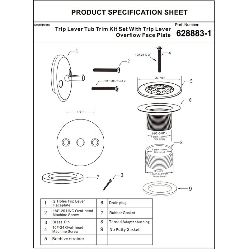 - Bath tub trim set with Trip Lever drain plug and Trip Lever faceplate